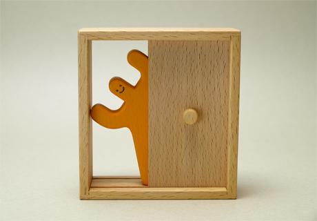 扉を左右に動かすと中の人形も一緒に動き、顔を出します。